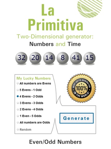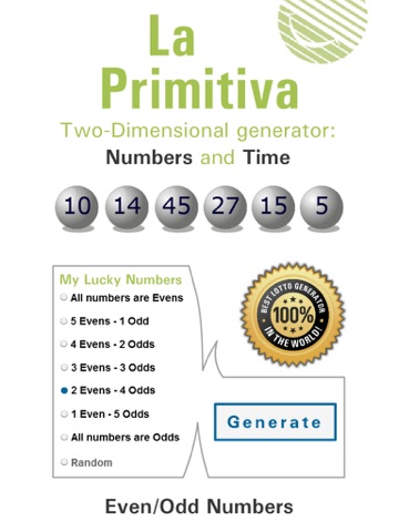 This two-dimensional app generating numbers contains an algorithm, UNIQUE IN THE WORLD that acts like real lottery draws. As in reality, every number is chosen in a certain time. This is how it happens with the app and it generates the time as well as the numbers, being the closest simulation to the real lottery draw.