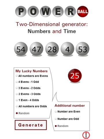 This two-dimensional app generating numbers contains an algorithm, UNIQUE IN THE WORLD that acts like real lottery draws. As in reality, every number is chosen in a certain time. This is how it happens with the app and it generates the time as well as the numbers, being the closest simulation to the real lottery draw.