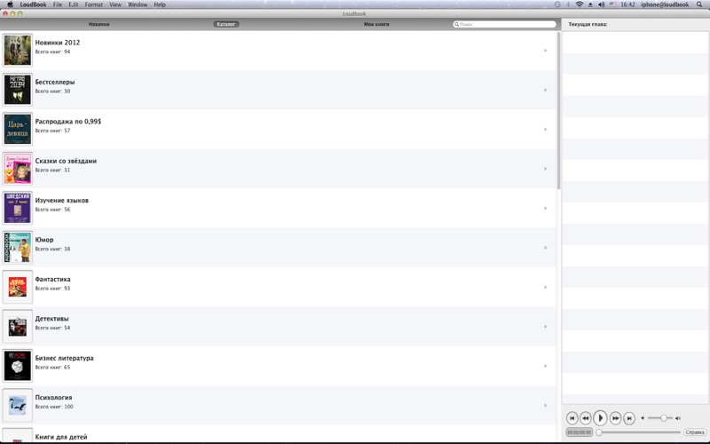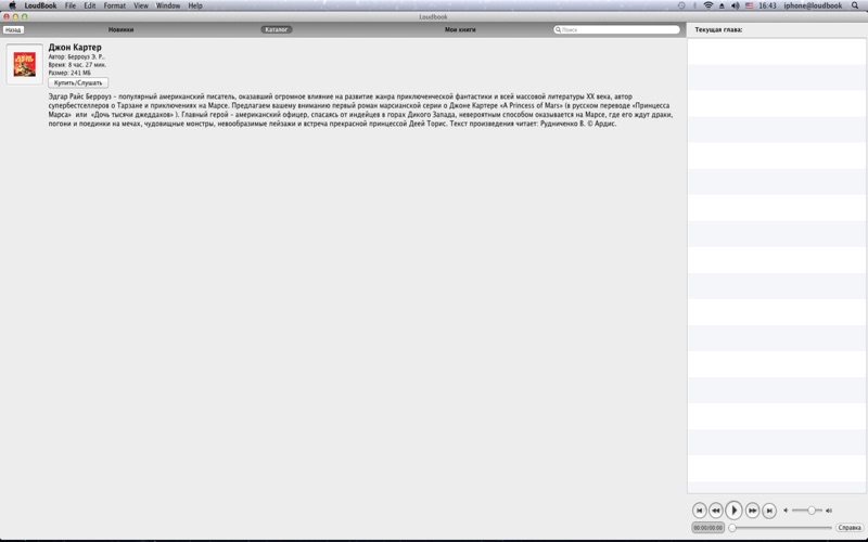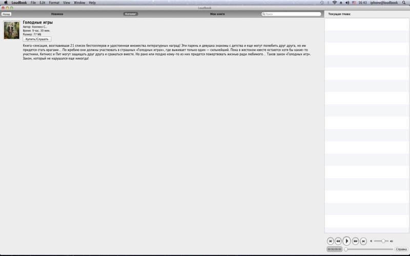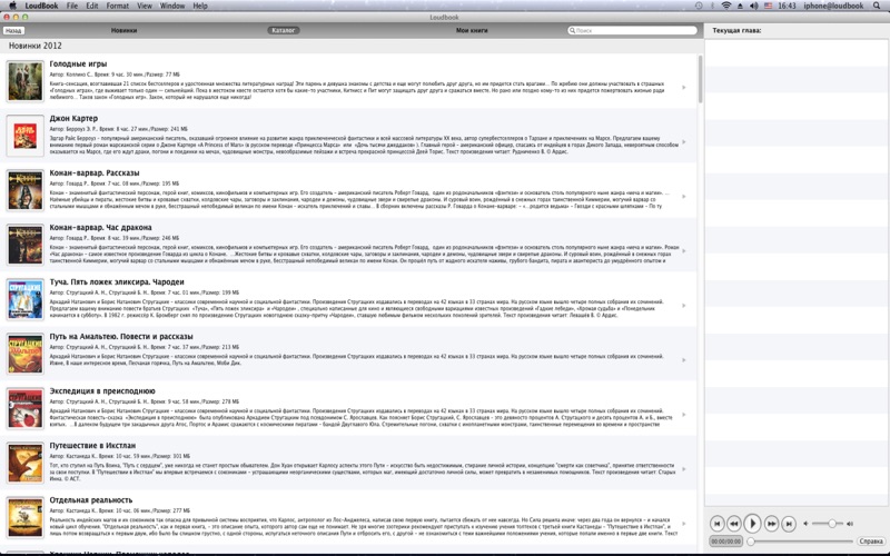 Идея неплохая, но реализация - не очень. Все книги платные. И это бы ничего, но бумажные аналоги дешевле в ряде случаев. Впрочем, это условный недостаток. Кроме того, было бы лучше цены указывать сразу, как это сделано в AppStore/iTunes, а не так, как сделано: кнопка "Купить/Слушать". Хорошо, хоть есть предупреждение о цене перед покупкой. Также непонятно, по какому изданию идет чтение. Нет выходных данных.