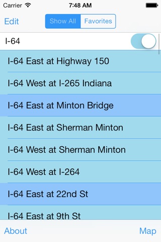 Touch the Favorite button on any camera page to copy the traffic cameras that matter to you to your Favorites list for faster access. Switch quickly from Show All to Favorites mode. In Favorites Mode the Previous and Next buttons follow the Favorites list.