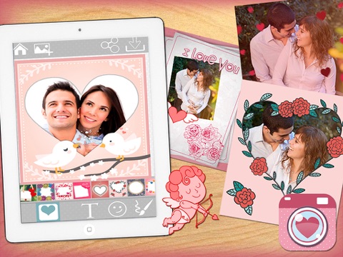 Simply upload an image from your gallery or take a new photo, select a photo frame from our romantic photo templates collection. Create your photo albums. Use our photo editor tool to create love cards with your messages and notes. Save your frames and share them on your social media profiles with your friends! You can also set them as background photo on your phone.