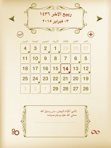 يقوم هذا التطبيق بعرض التقويم الاسلامي (التقويم الهجري) بطريقة شهرية مع امكانية استعراض بقية الاشهر بكل سهولة
