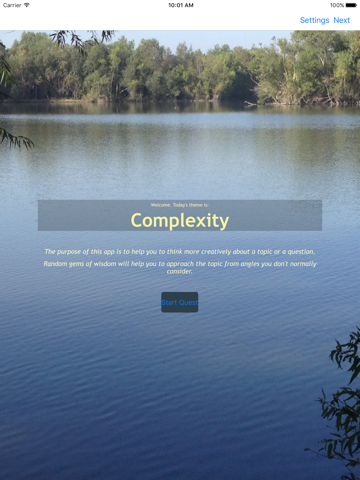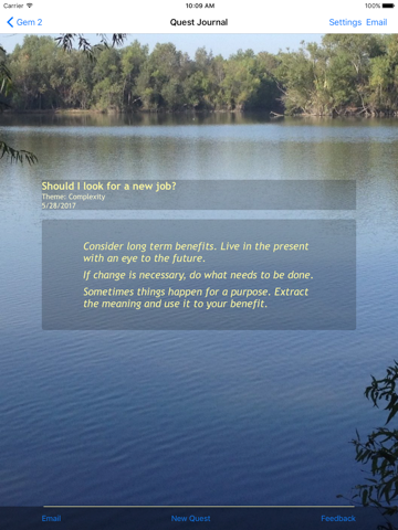 Take several quests on the same topic; random gems will trigger fresh thoughts each time through. Challenge yourself to deeply consider the gems; the ability to make difficult connections makes a quest more rewarding. If you get stuck, put the app aside for a few minutes until your thoughts bubble to the surface.