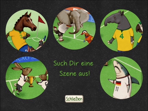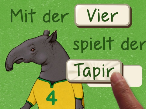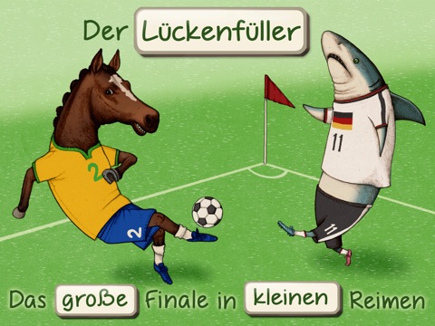 Passend zum Fußballereignis des Jahres kommt dieses kleine Spiel in Reimen von der Tochter eines echten Weltmeisters von 1954. Die Illustratorin Miriam Bauer präsentiert auf 5 besonders liebevoll handgezeichneten, bunten und lebendigen Szenen mit verschiedenen Tieren lustige und kurze Reime als Lückentexte. In einem spielerischen Umgang mit Wort und Text kann man die Löcher im Reim richtig oder falsch füllen, indem man mit dem Finger Wörter bewegt und dabei auf jeder Szene auch versteckte Animationen entdeckt.