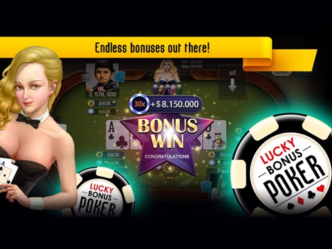 Lucky Bonus Poker is a community card poker game played with one standard 52-card deck. Each Player is dealt a two-card hand (hole cards) that can be used along with three or four of the community cards to create a five-card poker hand.