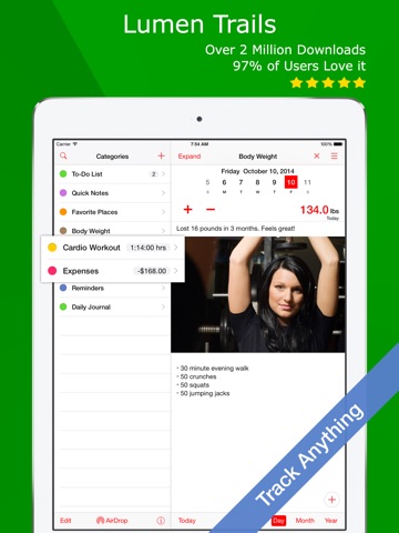 Lumen Trails Daily Tracker lets you take notes, make lists and keep track of other things in your life such as time, workouts, expenses, calories, food, weight, sleep or anything else you can think of, even where youve parked your car! Thousands of people use it every day, and they love it because it truly makes a difference in their lives.