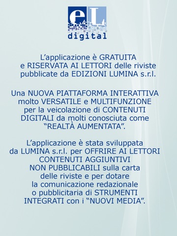 L’applicazione è stata sviluppata da Lumina s.r.l. per offrire ai lettori contenuti aggiuntivi non pubblicabili sulla carta delle riviste e per dotare la comunicazione redazionale o pubblicitaria di strumenti integrati con i “nuovi media”.