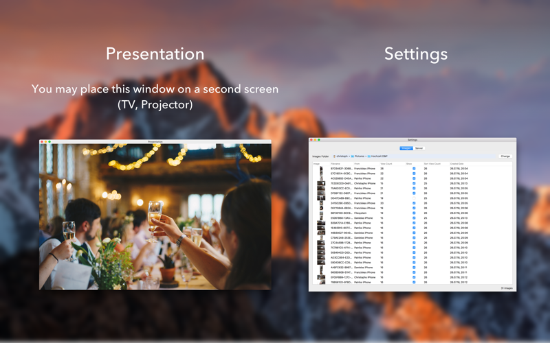 Take photos with your friends, guests or colleagues and present them live on tv, projector or on the mac so everybody can see the photos.