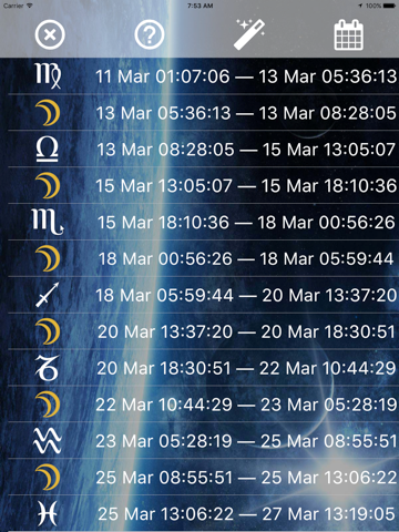 This application helps to you to know position Moon in Zodiac, to calculate void of course moon.
