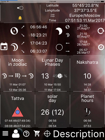 The major feature of Lunar Calendar 2018 is to calculate lunar day for any point of the Earth you want at any time you want. Of course, you can read astrological description and advices for everyday. Now it is supported two variants of lunar days: indian (new day each 12 degrees) and moon rise (new day each moon rise or new moon).