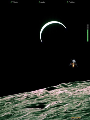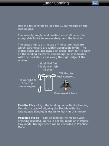 Paddle Play mode. Tilting the iPhone moves the landing pad instead of moving the lander. The main thruster is still controlled as before, but moving the landing pad instead of tilting the ship makes the ship MUCH easier to land. This option may be used alone or in combination with practice mode. It is easier to learn to land the ship by using the Paddle Play option.