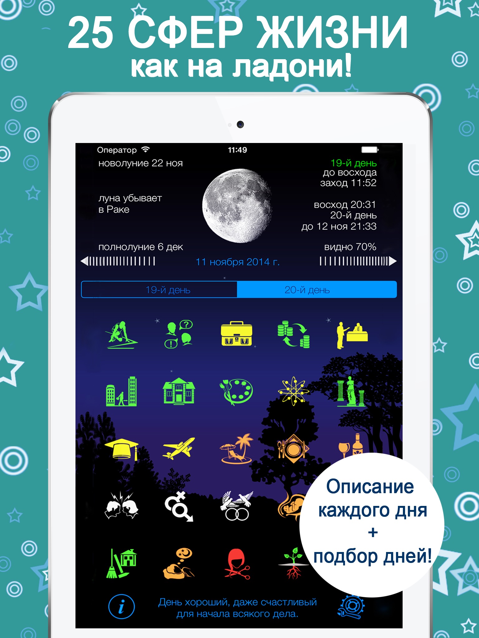 You can see the Moon phases, the Moon in zodiac signs, the manner of Moon influence on 25 main spheres of life.