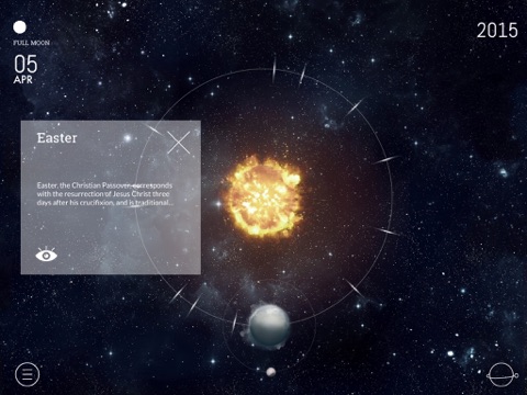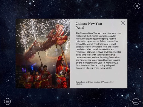 A lunar calendar as a cosmic clock. By manipulating the Sun-Earth-Moon trio, proceed through the year and discover a selection of cultural or natural events synchronised with the lunar cycle.