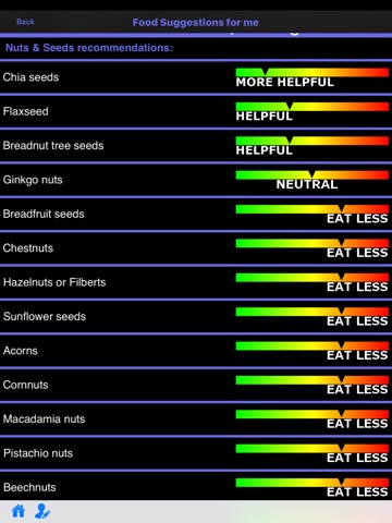 • ACTIONABLE information on what is good, what is bad, and what is neutral for your condition(s). We single out specific food items, and give you an ordered list of helpful and harmful foods within each food group.