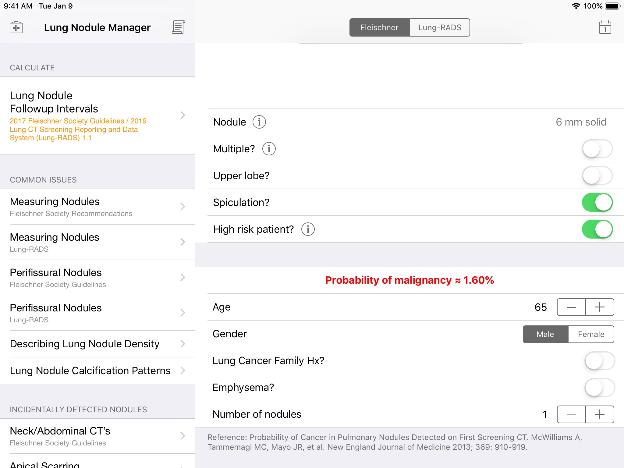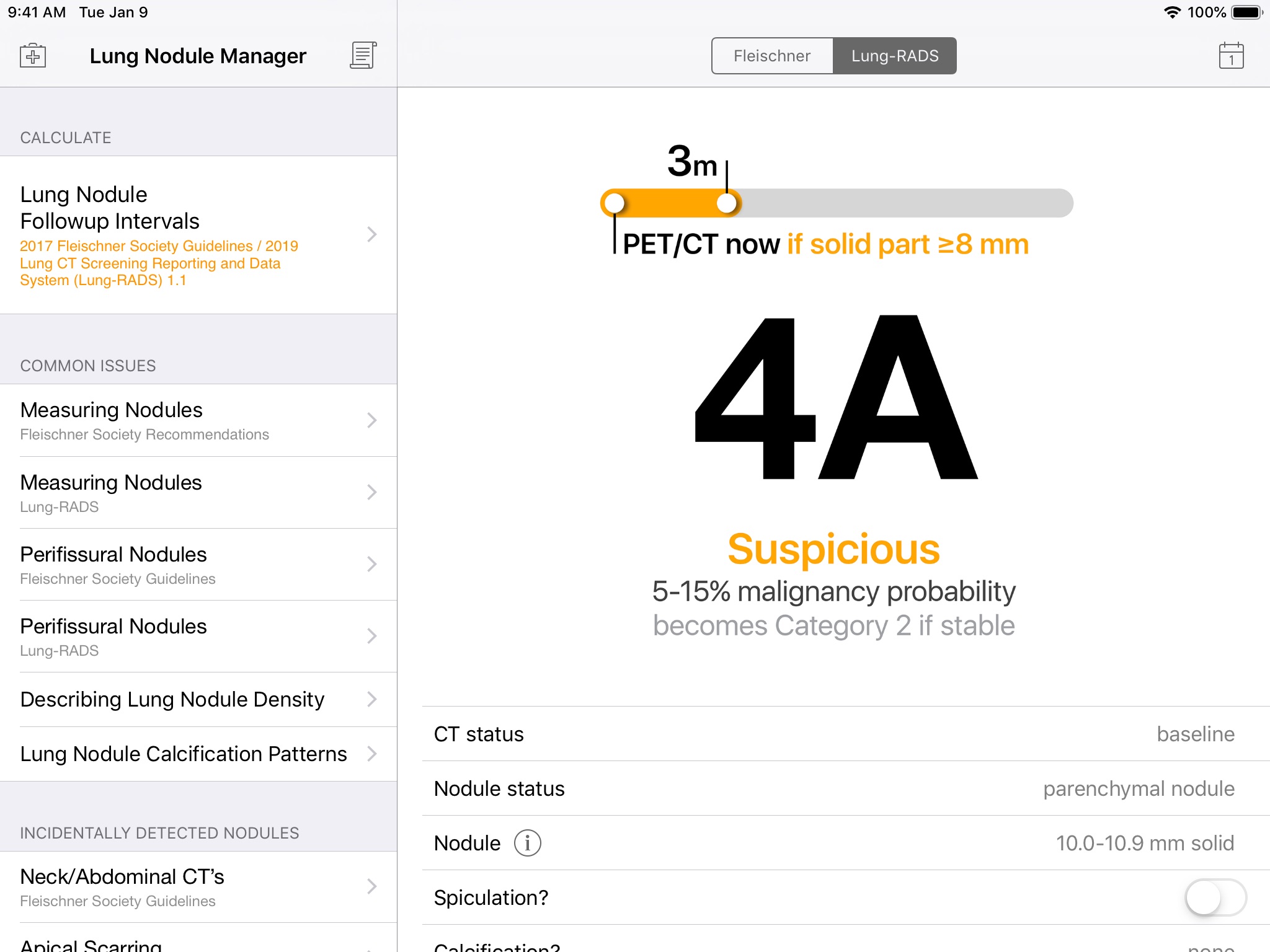 Lung Nodule Follow-up Guide is a clinical decision-support guide that streamlines the evaluation and management of lung nodules discovered incidentally or through screening. Built on the Fleischner Society Guidelines 2017 and ACR Lung-RADS v2022, including the latest "S" modifier for clinically significant incidental findings, the app provides clear, step-by-step guidance at the point of care. Whether youre in radiology, pulmonology, or primary care, Lung Nodule Follow-up Guide helps you apply standardized recommendations with clarity and consistency.