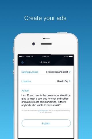 You have free choice: flirt, chatting, love, relationship or sex. Any Luster user can choose it. Luster gives you an opportunity to find a partner according to your preferences and dating purposes.