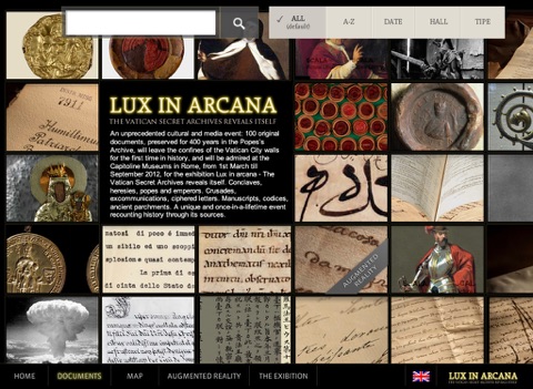 The application, created by Accenture for the exibition Lux in Arcana - The Vatican Secret Archives reveals itself, that will take place at the Capitoline Museum untill the end of September 2012, will allow you to explore, in a fast and easy way any of the 100 documents showed at the exhibition. You will be able to view technical dossier, pictures, deeper informations and curiosity about the main historical figures and multimedia extra content (such as audioguide or augmented reality). The application will be available in English.