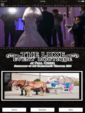 This is the official app for The Luxe Event Boutique. The Luxe Event Boutique at Fall Creek opened in April 2013 as an expansion of My Daughter’s Wedding, LLC (MDW)! The Luxe is a full-service production company for weddings, showers, adult and children birthday parties, anniversaries and any other special occasion! We can save you valuable time and money by eliminating the need to engage numerous vendors. Our services include, but are not limited to, coordination, couture invitations, envelopes and programs, calligraphy, popcorncandy buffets, silk floral design, linen rentals, diaper cakes, wedding jump brooms and much more!