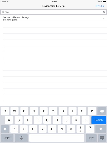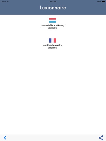 Luxionnaire intègre également un moteur de conversion de valeur numérique en texte de 0 à 1 000 000. Exemple, vous écrivez 134 dans la barre de recherche et pourrez voir en toutes lettres la traduction en Luxembourgeois et en Français.
