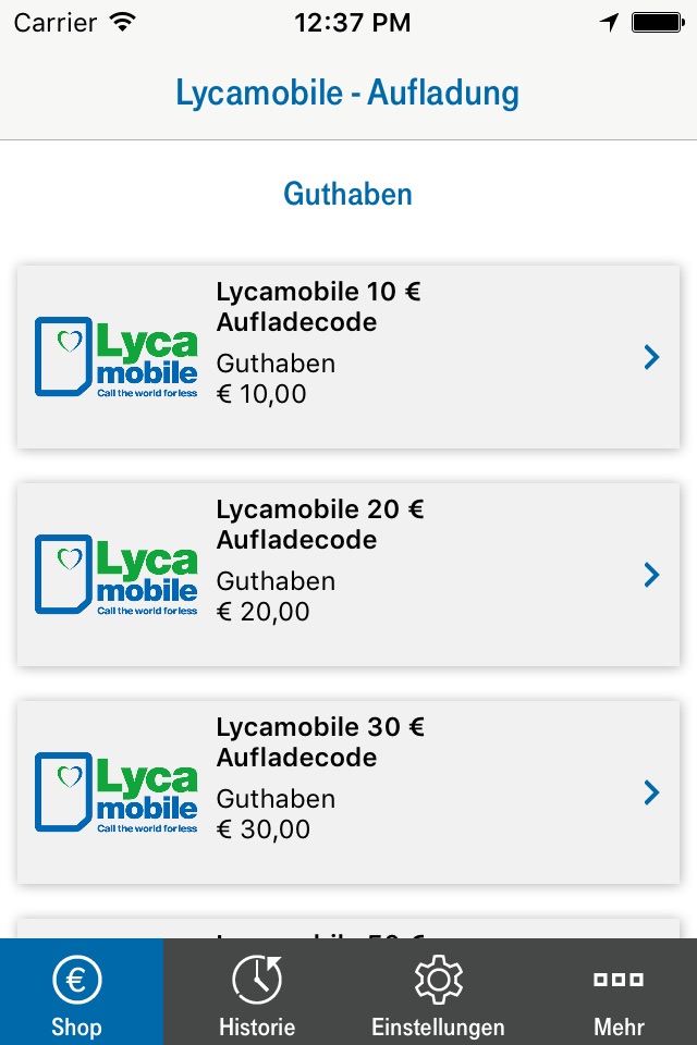 Mit dieser App können Sie jederzeit Lycamobile Guthaben für sich selbst und andere aufladen. Sie brauchen dazu einfach nur die aufzuladende Lycamobile Rufnummer anzugeben und die für Sie passende Bezahlmethode auszuwählen. Das Guthaben wird der Lycamobile Rufnummer sofort nach Zahlungseingang gutgeschrieben.