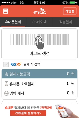 -결제 : 비밀번호를 입력하면 1회용 바코드가 생성됩니다. 엠틱 가맹점에서 바코드 스캔을 통해 결제가 가능합니다.