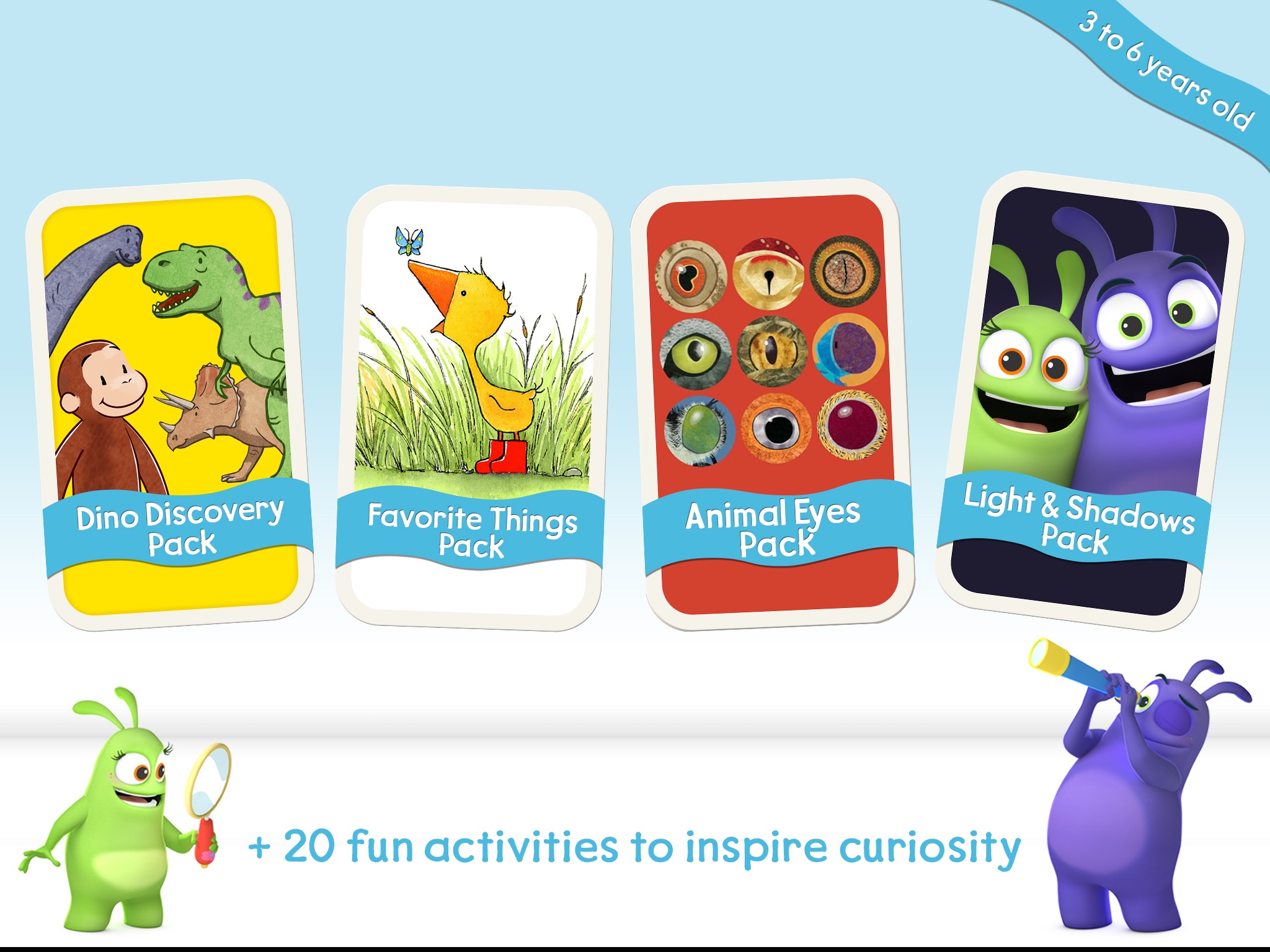 App comes with Izzy and Mac’s Light & Shadows app pack, with additional Gossie’s Favorite Things, Curious George Dinosaur Discovery, and Steve Jenkins Animal Eyes app packs available for purchase.