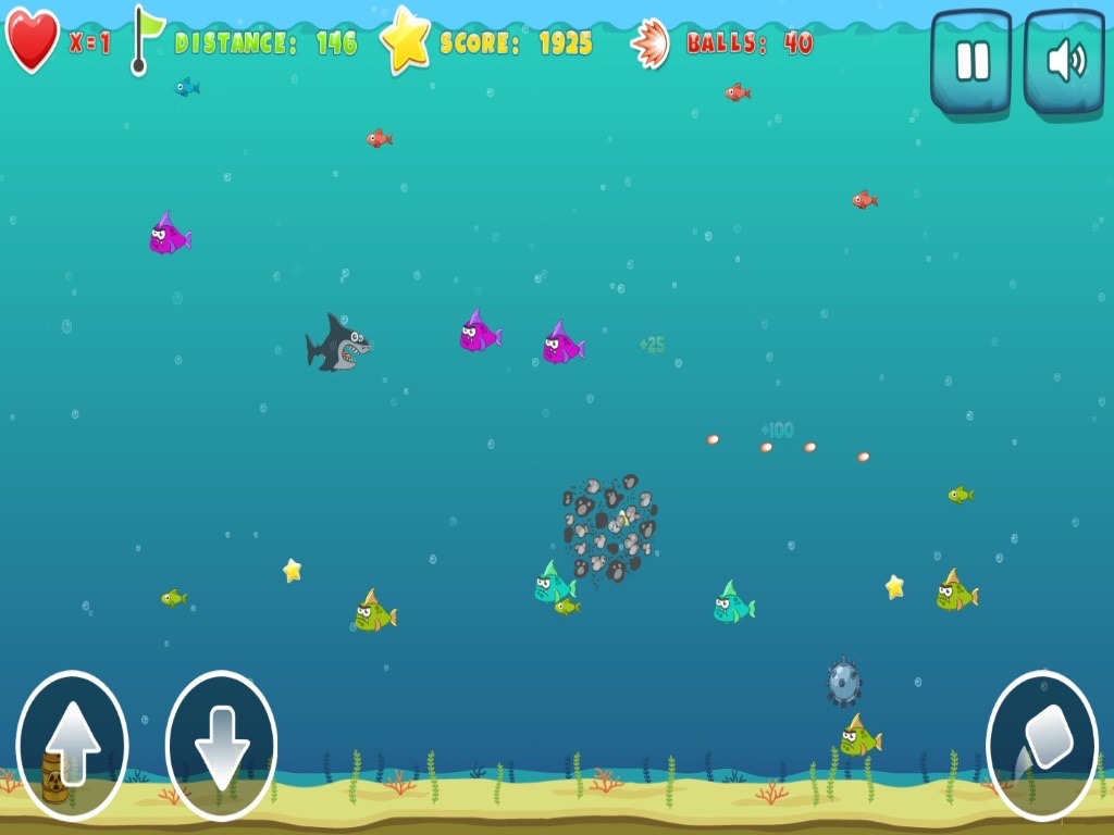 Mad shark, is a fascinating and beautiful game in which you have to collect fish, stars, life, super features and various improvements and destroy submarines, mines, missiles and radioactive barrels!