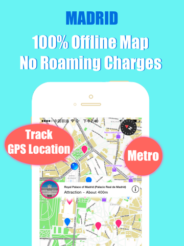 Madrid Offline Map is your ultimate oversea travel buddy. Offline GPS locates and tracks your position in Madrid at real time. The most important feature is: NO 3G/4G, NO Wifi and absolutely NO Network Data needed. 100% offline. This app provides you offline city map with all the metro/train stations, metro route search, must-go tourist attractions (red pin) plus other hundreds of POI -Point of Interests (blue pins). Save you expensive roaming charges while you are traveling abroad.