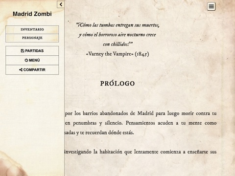 Novela episódica de ficción interactiva —del estilo elige tu propia aventura— donde tú eres el protagonista. ¿Podrás sobrevivir en el Madrid de los muertos?