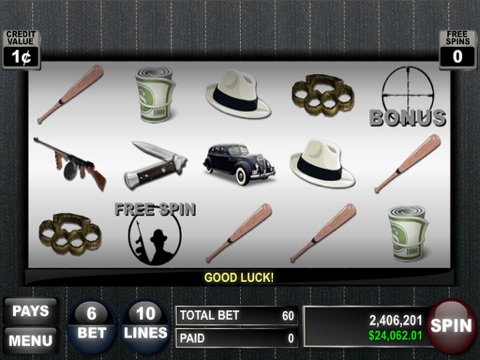 Mafia Money (5 Reel Slot Machine) with more features, more lines, higher limits, and more chances to win than ever before! Swipe up for a max bet if you’re feeling lucky. Swipe down to spin the reels. Up to 30 credits per line and up to 15 lines per game give you the winner’s edge! Changeable credit values ranging from 1¢ to $10. Daily game cash rewards just for playing. Earn your way to 60 trophies and piles of cash.