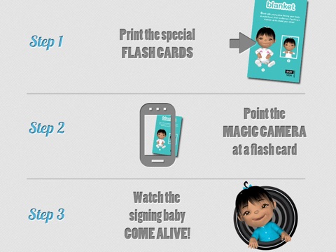 Download the magic camera and hold it in front of the special Baby Sign and Learn Flash Cards to experience baby signing in magical augmented reality for the very first time.