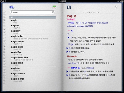 방대한 내용을 포함하는 English-Korean-English사전은 여러가지 형태로 많이 나와있지만 그중에서도 특히 Magic English-Korean-English사전은 아이폰과 아이팟에 최적화되여 제작되였으며 다국어건입력과 수직/수평보기, 뜻풀이, 어원 그리고 그밖에도 많은 기능들이 제공됩니다.