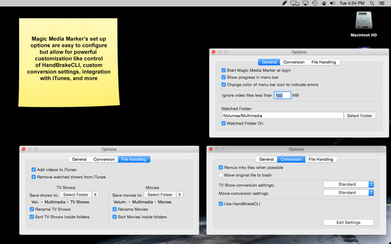 Magic Media Markers main purpose is to process video files and make them pretty in iTunes and on your Apple Devices. Feed Magic Media Marker a video file and it will automatically determine if the file is a TV Show or a Movie by its file name and download the appropriate metadata and artwork for you. Magic Media Marker is designed to be a “set it and forget it” kind of App needing no user interaction.