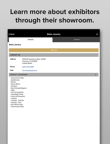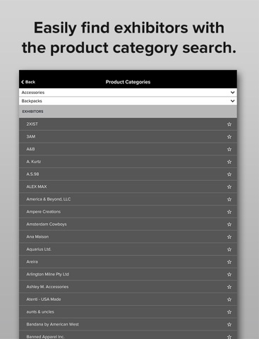 + EXHIBITOR DATABASE: Get brand listings and booth numbers all in one place. Just search by name or product category.