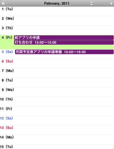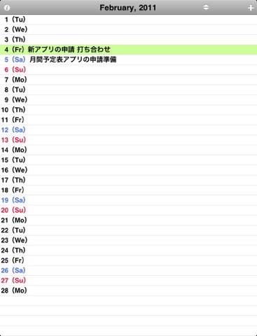月間表示はとても見やすく、またシンプルな構成なので予定表示欄が最大限取られており、複数の予定もかなり表示できます(さいすけより表示できている) また、余計な設定をしなくても、そのまま標準カレンダーの設定を引き継げるため、OTAでの同期やgoogleとの同期も問題ありません。 一つだけ、スワイプで前後の月に移動する動作がもっさり(というより、1〜2秒待つ)なのが残念。前後月だけでも先読みなどで、高速化が図れないでしょうか? また、これはアプリの趣旨にそぐわないかもしれませんが、日表示などで重なる複数の予定が標準カレンダーのように関係がわかるモードがあると、もはや神アプリでしょう。 iPhoneカレンダーの決定版になりそうな予感です。