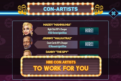 You’ll own casinos, resorts, islands... you name it. Hire helpful Con Artists to run your underworld operations and upgrade your businesses to max out your revenues. Just keep taping to make more money!