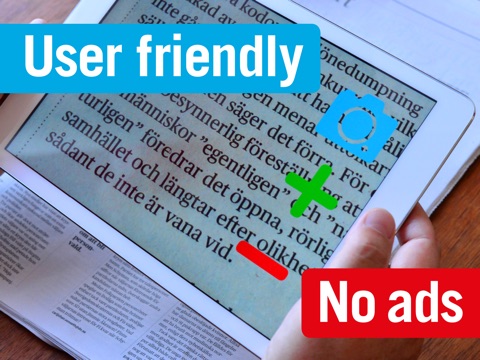 A magnifying app specifically designed with few and very large icons for users with impaired vision. For everyday use: In your TV-couch, reading recipes in the kitchen, reading price tags while shopping and when you travel. No In-App Purchases or ads. Very user friendly.