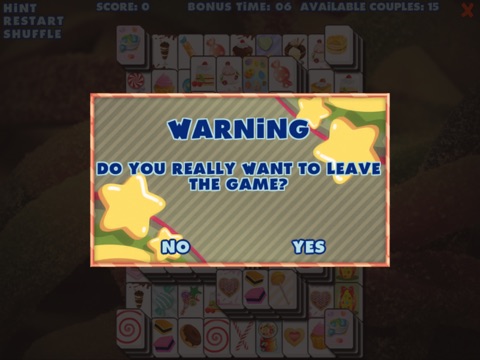 The game ends if you have no more pairs of identical tiles or you cleared completely the board. You can help yourself with hint button to show available couples but youll lose points for this action.