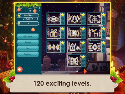Complete Mahjong levels to suit any taste – classic, themed and fast levels to while away the time during the holiday bustle, and tall 15-layer levels and giant 200-tile levels for those long Christmas evenings! Each level has its own exciting goals and contains special golden tiles! The most daring players can get unique rewards and trophies!