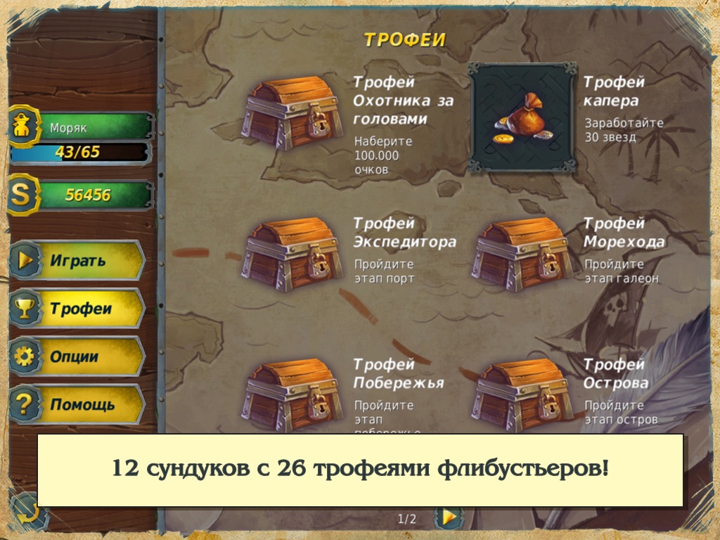 Set sail from Port Royal on a ship called the Golden Hind and head for Hard Luck Island. Legend has it that untold treasures are hidden there. The treasure troves location is encoded in special tiles which you have to remove to reach the gold! To reach the prized hoard, you must complete 6 stages of varying difficulty: youll encounter themed, grandiose levels with 300 tiles, high levels with 15 layers and levels made entirely of gold! The greed and generosity of pirates knew no bounds. The smugglers path wasnt easy – point goals and limited moves will present a serious challenge to your abilities.