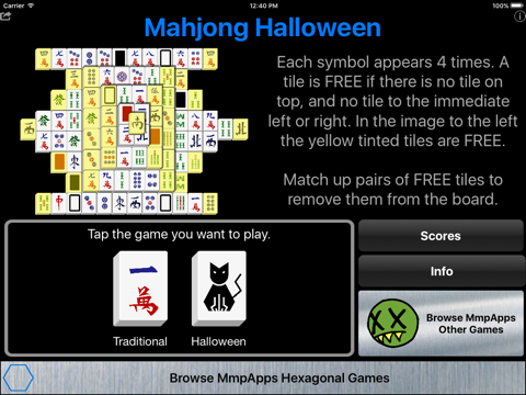 Traditional Mahjong solitaire played with standard tiles or special Halloween tiles. These include jack o lanterns, witches, ghosts and more.