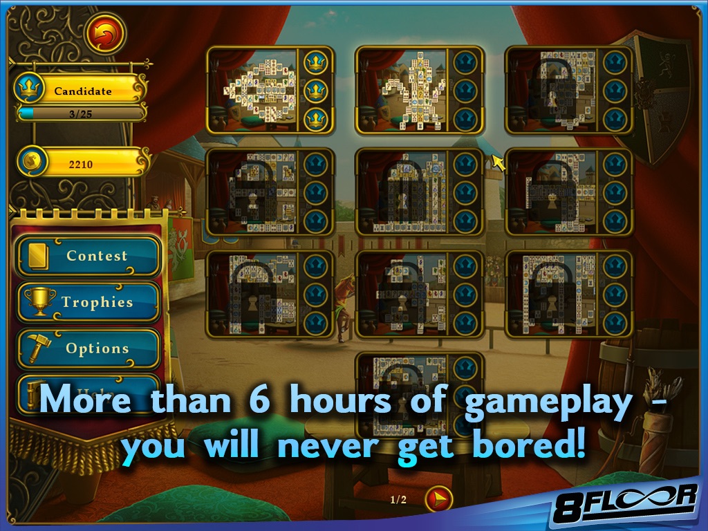 Playing Mahjong, you’ll have the opportunity to visit different parts of the royal castle – from the Garden and the Armory all the way to the Throne Room!