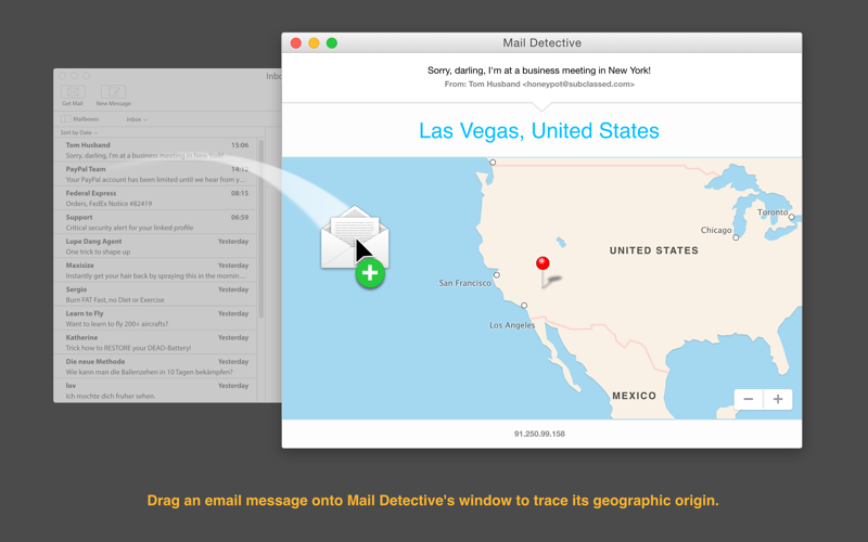 Mail Detective tries to determine the geographical origin of email messages in your INBOX via geolocation by parsing the message headers for the senders IP address. Simply drag the email from your mail program and drop it onto the app’s window - Mail Detective will tell you the country and, if this information is available, the city from which the email was sent.