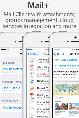 Mail+ is a mail client to read and manage your emails and send emails with attachments to single contacts, to groups, to handpicked set of contacts or to distribution lists. You can optionally attach photos, videos, documents, emails, locations information with map and address, audio clips, pasteboard content and contacts information (vCard or text).