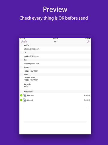 SmartEmail can send personalized bulk email using data from an Excel file.You can personalize the email’s subject and body. For example, if you enter “Hi {firstName}, Happy New Year” in the body, the app will take the first name of the recipients and personalize the body, generating as “Hi Jack,Happy New Year” , “Hi Tom, Happy New Year”…