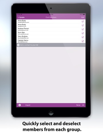 Try MailShot for free with up to three groups, of up to five people in each. A simple in-app upgrade unlocks the ability to create up to 100 different groups of 100 or more contacts (Limits depend on your email provider.)