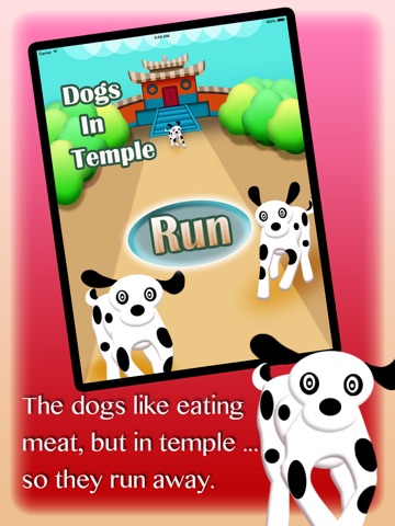 The three dogs in a temple like eating meat, but they cannot find any in the temple. One day, a stranger said to them, if they could run 2000 meters away from the temple in a special way altogether, they could have a lot of meat and bones to eat, so they decide to try.