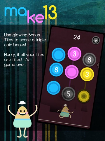 Follow your pal Wilson Girdlesprings on a lovely walk while you shift tiles up or down to add or subtract one. Select tiles that add up to 13, and collect shiny coins for each tile you use! If youre really good, youll use the glowing Bonus Tiles in a strategic way to earn a triple coin bonus...use as many tiles in one shot to make13 as you can for the highest score!