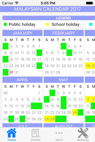 A comprehensive calendar app to view Malaysian Public and School Holidays in a glance. As an added feature, weve covered Singapore holidays as well. You can also add and manage your appointments which will be reflected in the home page, together with the Public Holidays and School Holidays colour codings.