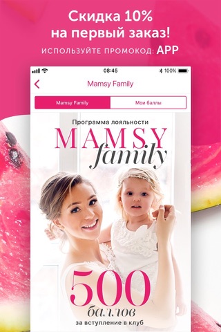 Mamsy Family — это программа лояльности, которая сделает шопинг еще приятнее. Вас ждут секретные распродажи, подарки и персональные скидки. Копите баллы и оплачивайте ими до 50% от суммы заказа! А еще вы сможете участвовать в специальных акциях, конкурсах, викторинах, организуемых компанией Mamsy. Шутки в сторону, мы разыгрываем серьезные подарки!